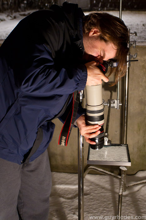 After much trial and error with numerous lenses and configurations, I found that shooting through a backwards Canon 28mm-70mm f2.8 zoom lens with my Canon 100mm-400mm f4.5-f5.6 zoom lens gave me a passable macro setup. I used a glass picture frame as my shooting platform for the snowflakes, held with 2 c-stands. A third c-stand was used to stabilize my body and the camera. Focusing on the snowflakes was done by sliding the camera and my arms down the c-stand (while intently controlling my breathing) until the snowflakes and ice crystals were sharp, all while holding the backwards lens against the front element of the lens attached to my camera.