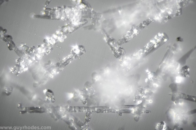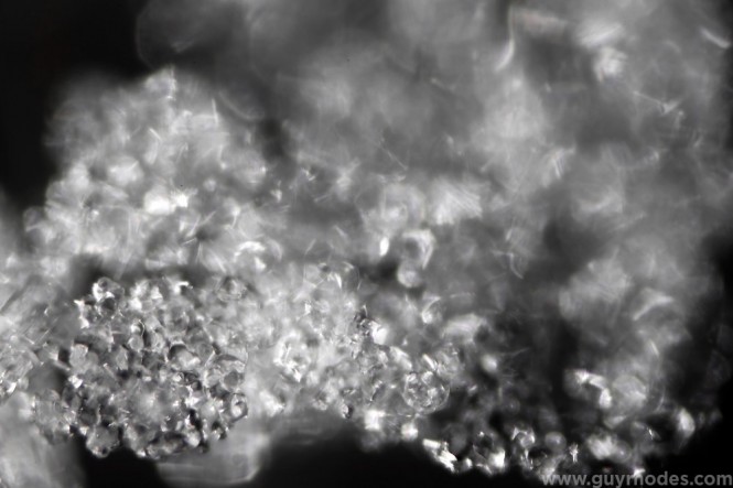 This image is the result of shooting through many accumulated needle snow flakes. You can see the in-focus needles at the top of the pile, with the out of focus flakes below. This created a very painterly effect.