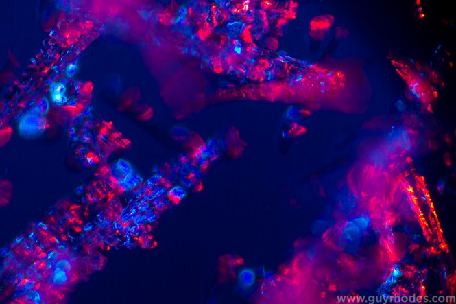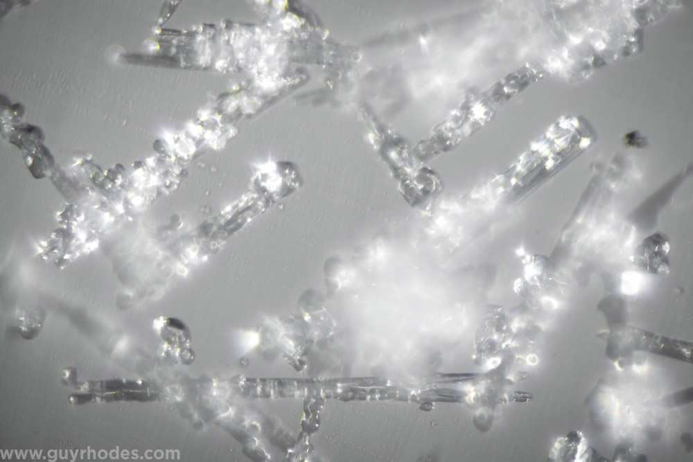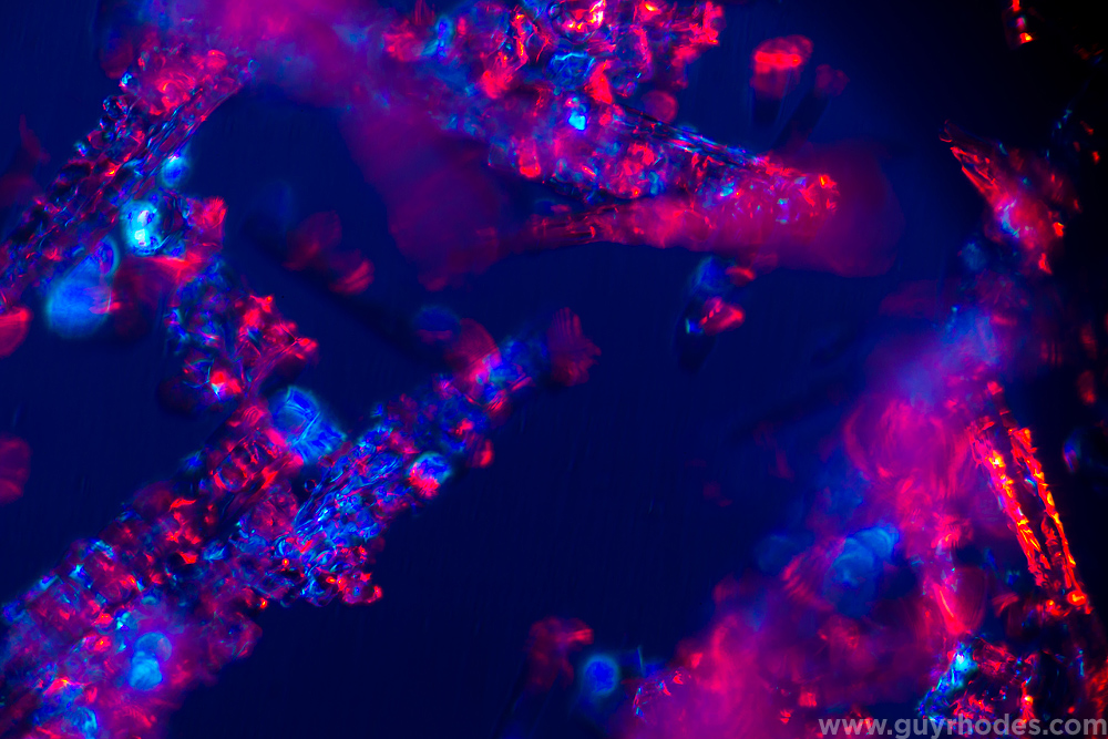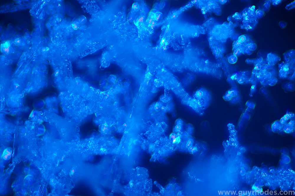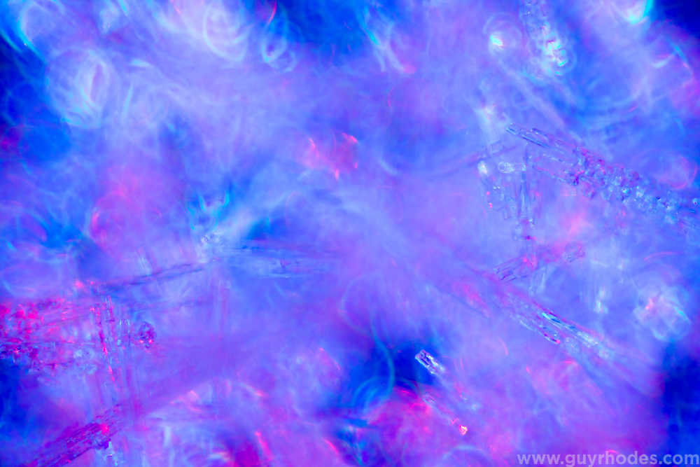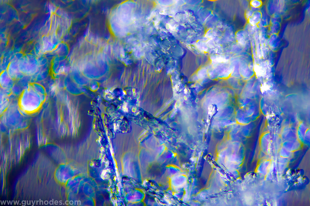 When shooting through two lenses held front to front, something they’re not designed to do, you’re going to reveal many of the flaws in each lens that aren’t normally seen. I decided to exploit the chromatic aberration in this image (the rainbow halos around the ice crystals) that I corrected from my other white light images, creating an interesting color palette.