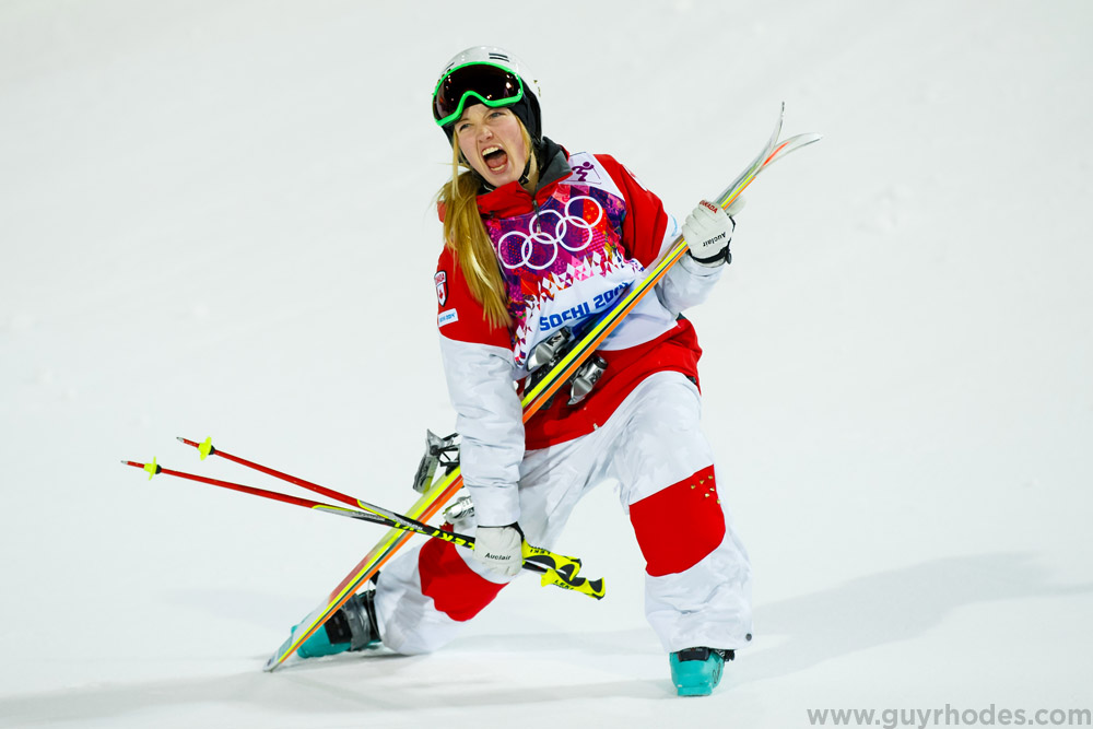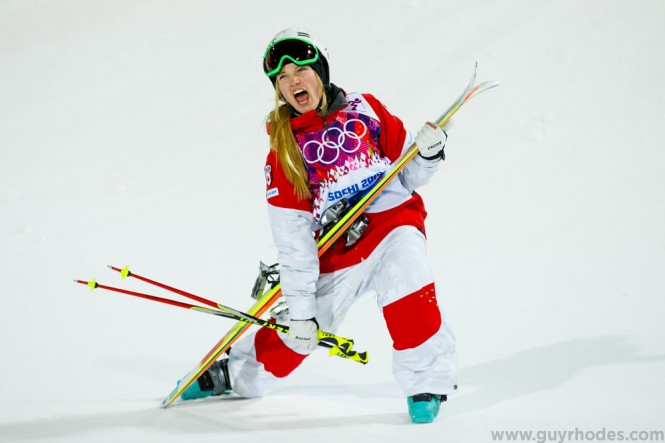 Justine Dufour-Lapointe (CAN) celebrates winning gold in ladies’ moguls finals at the Sochi 2014 Olympic Winter Games at Rosa Khutor Extreme Park.
