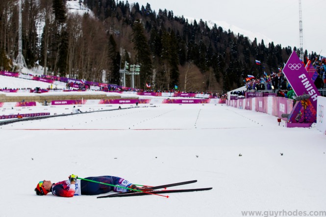 Callum Smith (GBR) lays at the finish line after the men’s skiathlon during the Sochi 2014 Olympic Winter Games at Laura Cross-Country Ski and Biathlon Center.