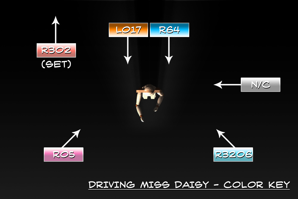 The color key for Driving Miss Daisy included a warm frontlight color with a hint of pink (R05) to accommodate the multiracial cast, along with an extremely subtle cool color (R3206) as its compliment, which in actuality, also served as another warm color when dimmed down. The warm feel continued for my wall toners (R302), and my toplight (L017), which I joked was inspired by looking through a glass of iced tea, something Daisy might have served to her guests? My cool toplight (R64) was used for nighttime looks as well as later in the show when Daisy becomes older and more unstable. Rounding out my systems was a no-color “kicker” wash from stage left, something I’ve brought over from my video work. I usually throw this in to help add definition to actors on shallow stages.
