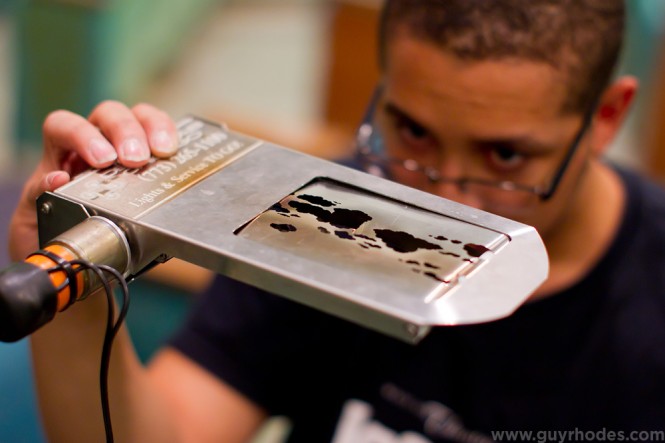 This was my first time using a GAM Film FX unit, and I was disappointed with how often the thin metal loop in the unit became stuck and stopped moving. The rental house warned me that the loops didn’t last too long, so I can’t say I was completely surprised that the rental loop wasn’t flawless. Luckily, WSTG master electrician Andre Campbell (pictured above) took it as a personal challenge to make the unit work, long after I’d given up. He did just that after about 45 minutes of coaxing the loop with my Leatherman.