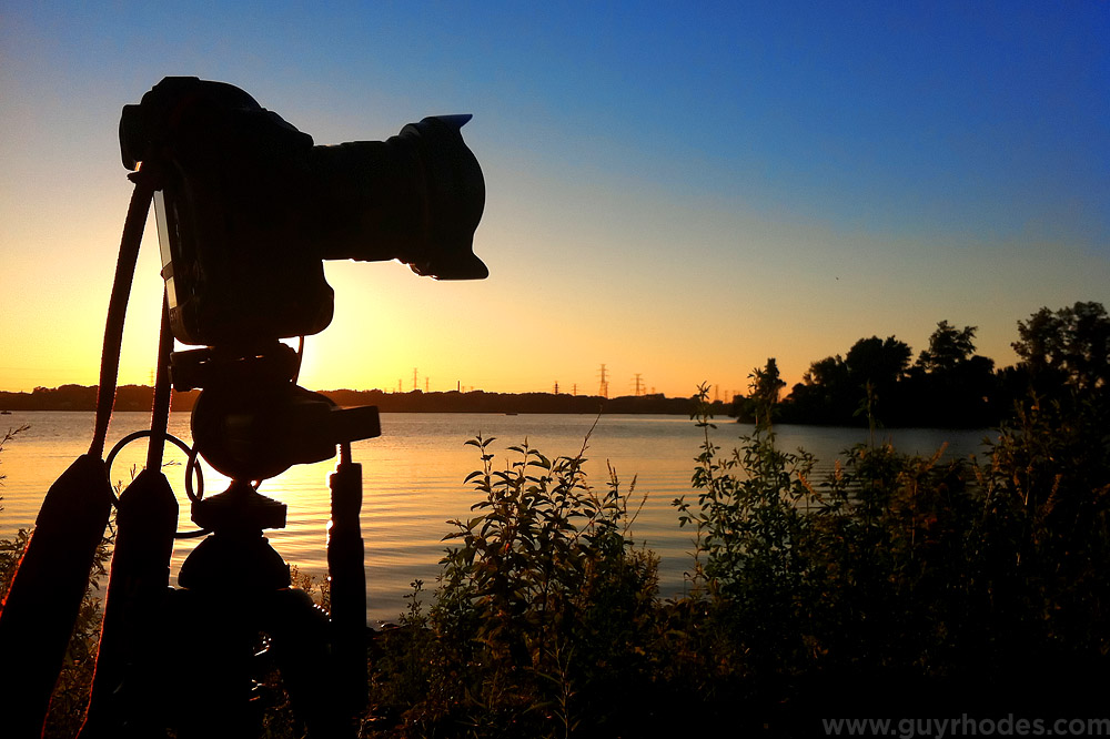 Upon arriving at Wolf Lake, I scouted and chose a location close to the shoreline that overlooked the island where the fireworks would be fired from. This would give me an unobstructed view of the sky as well as the water in the foreground for possible images of reflections. Above is an iPhone snap of my camera set up on a tripod (a must) with a cable release. All that I had to do now was wait for the sun to set.