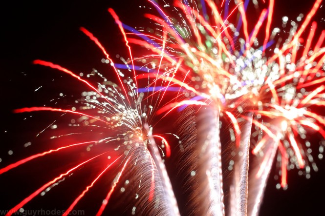 This is what happens when a fireworks shell doesn’t make it all the way into the air and falls back down on the ground before exploding. You can see the yellow “stars” flying well above the 30′ tall trees on the island, giving you a true sense of scale for just how large a firework explosion is in the sky overhead. I also like how the stars from the bottom part of the shell are bouncing around all over the ground. The guys hand-firing the show were near the red patch of light near the right of the frame, and as far as I know, were OK.
