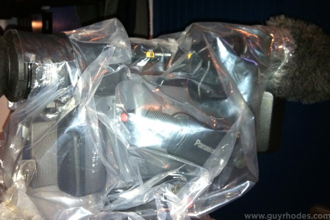 When the snowfall increased on Tuesday night, I decided to switch over to video to better illustrate the blowing snow and difficult driving conditions. Though I’m without a “real” rain slicker for my Panasonic HMC150, a thick, clear plastic bag that was going to end up in the trash proved to be the perfect substitute. While my mishaps are not as well-documented as some of my colleagues’, I have trashed a few cameras in my day, all due to moisture. You can’t shoot in severe weather without protection!