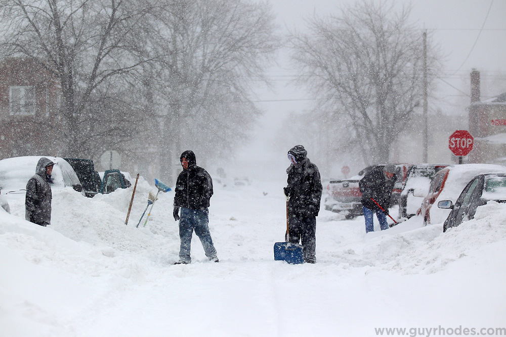 Drajan Govceski of Whiting, Ind., shovels snow from the entrance of his rental property in the 141st block of Indianapolis Blvd. in East Chicago. I shot this image from atop snow from a neighboring parking lot that had been plowed into a very tall pile. I was startled, while trying to climb down, when I broke through the surface of the snow and fell almost completely into the pile up to my chest. For me, this was the moment when the novelty of the blizzard officially wore off.