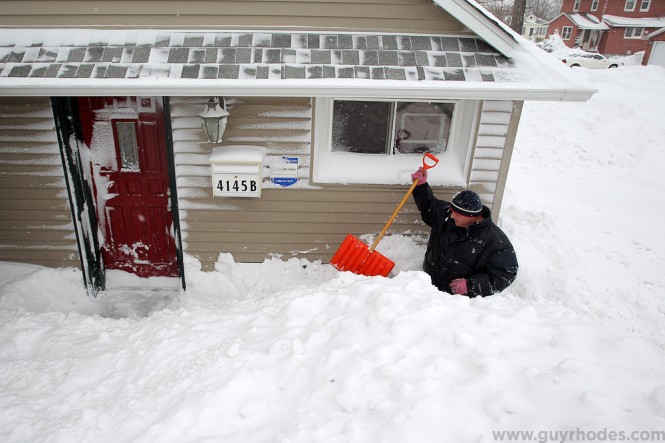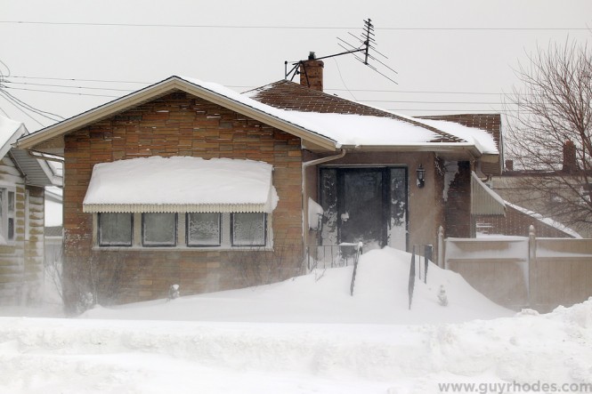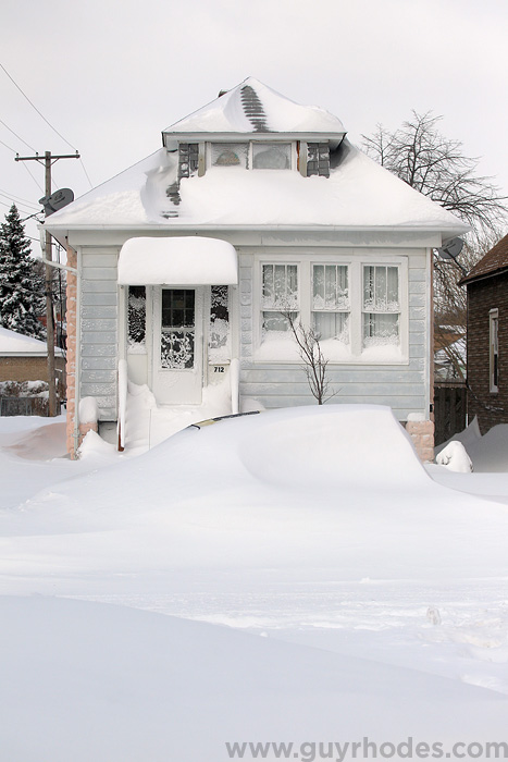 Snow drifts as high as the first floor, completely covering stairs (and here, half of the front door) were a common sight on many homes.