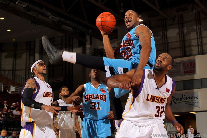 Gary Splash’s Robert Eldridge (top) shoots up and over Lansing’s Carlos Gill during the fourth quarter at the Genesis Center in Gary, Ind., Sunday, April 17, 2011.