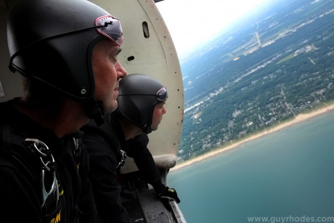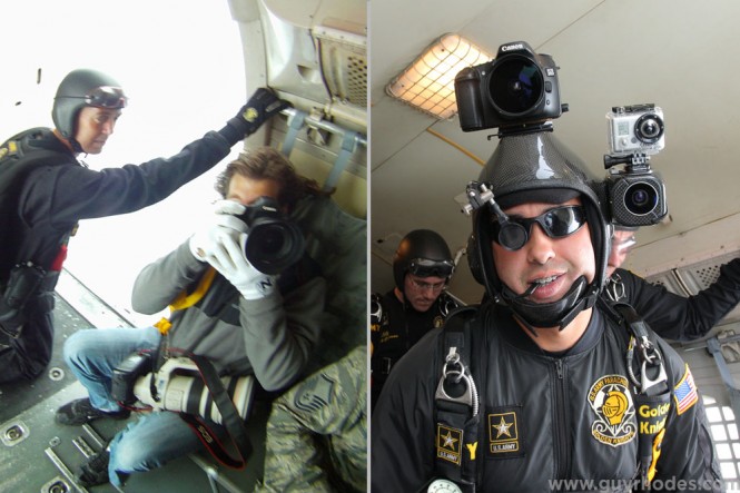 Here’s my Go Pro’s view of me (left) and my view of the Go Pro with Staff Sergeant Howard Sanborn just before the team exited the aircraft 12,500 feet above Marquette Beach. Sanborn’s other cameras, a Canon 30D and a Sony video camera, are always mounted on his helmet to document the team’s jumps. In flight, Sanborn triggers the 30D with a mouth switch, seen between his teeth, and uses a sight in front of his right eye to compose the video image. The Go Pro was mounted above the Sony video camera (after a thorough surface cleaning) using one of Go Pro’s adhesive mounts, and set to record 5-megapixel still images once every three seconds.