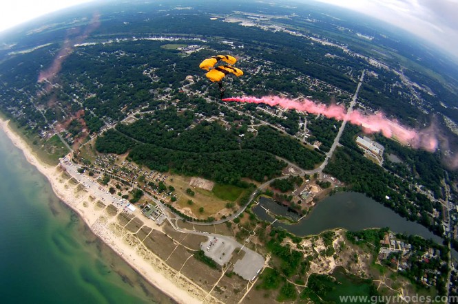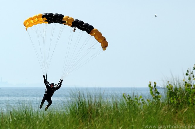 Sergeant Dan Cook with the U.S. Army Golden Knights Parachute Team salutes while exiting the door of the team’s Fokker C-31 aircraft 12,500 feet over Marquette Beach.
