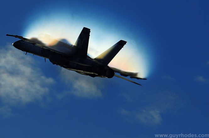 Condensation forms above the wings of a U.S. Navy F/A-18 Hornet while executing a tight turn during the Gary South Shore Air Show held at Marquette Beach in Gary.