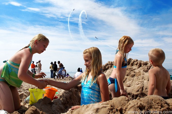 (From left) Paige Wood, 10, of Merrillville, Ind., works on a sand creation with her best friend Hailey Karpen, 10, of Merrillville, along with Hailey’s sister Kendall Karpen, 7, and Paige’s brother James Wood, 4, on Marquette Beach in Gary, Ind., as the Aerostars Formation Aerobatic Tean performs in the background during the Gary South Shore Air Show.