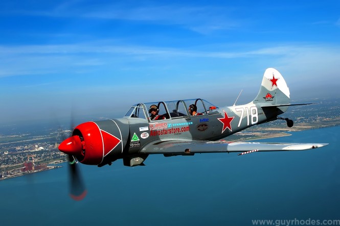 Aerostars Formation Aerobatic Team pilot Paul Hornick of Poplar Grove, Ill., flies a Soviet Yak-52TW aircraft in formation over Lake Michigan near Gary, Ind., during a demonstration flight for the Gary South Shore Air Show.