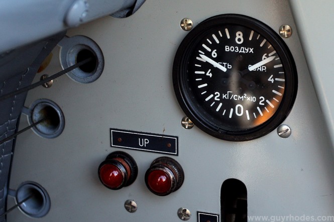 I found it interesting, but not surprising, that some of the gauges inside the Soviet-designed Yak-52TW were labeled in Cyrillic lettering. Exposed control cables for the aircraft’s manually controlled flight surfaces are also visible near the left side of the frame.