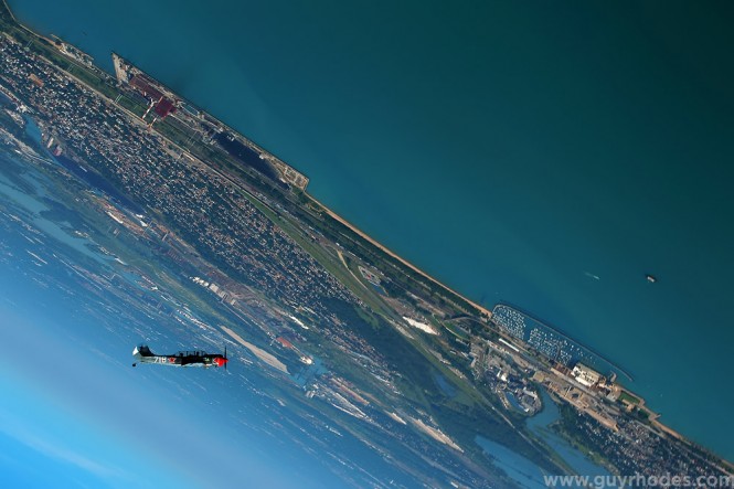 Aerostars Formation Aerobatic Team pilot Dave Monroe of Crystal Lake, Ill., pulls a Soviet Yak-52TW aircraft through a loop over Lake Michigan near Gary, Ind., during a demonstration flight for the Gary South Shore Air Show. Away from the team, Monroe flies Boeing 767’s for American Airlines. This image was also captured using a Go Pro Hero in still photo mode, mounted to the aircraft’s canopy via a suction cup.